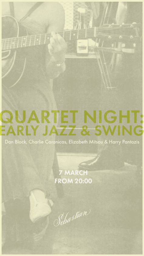 A special evening of early jazz and New Orleans classics with some of the finest musicians around. All the way from the States, Dan Block brings his tenor saxophone, Charlie Caranicas joins in on trumpet, and Jeepers Creepers’ Elizabeth Mitsou handles guitar and vocals, with Harry Pantazis rounding out the quartet on contrabass. This is live jazz in th
