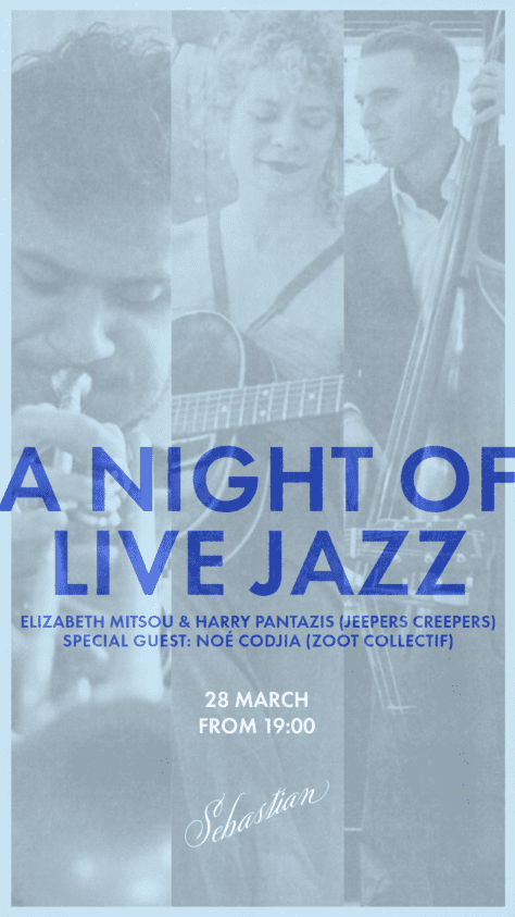 A night of live jazz at Sebastian. Jeepers Creepers return to the Athenian Riviera, with Elizabeth Mitsou (guitar, vocals), Harry Pantazis (contrabass), and special guest Paris-based trumpeter Noé Codjia (Zoot Collectif) for an unmissable live. This is timeless jazz in the intimate candle-lit setting of Sebastian, so come and let the music transport you some