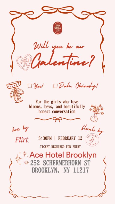 This Galentine’s Night, Sad Girls Club is coming together to celebrate the most important relationship of all, the one you have with yourself and your community. Join us for a special evening hosted by Sad Girls Club FounderElyse Fox, Licensed Therapist and founder of Mind Matter Mantra Jennifer Ochiagha and Inward Space Founder Shaina McGregor for an intima