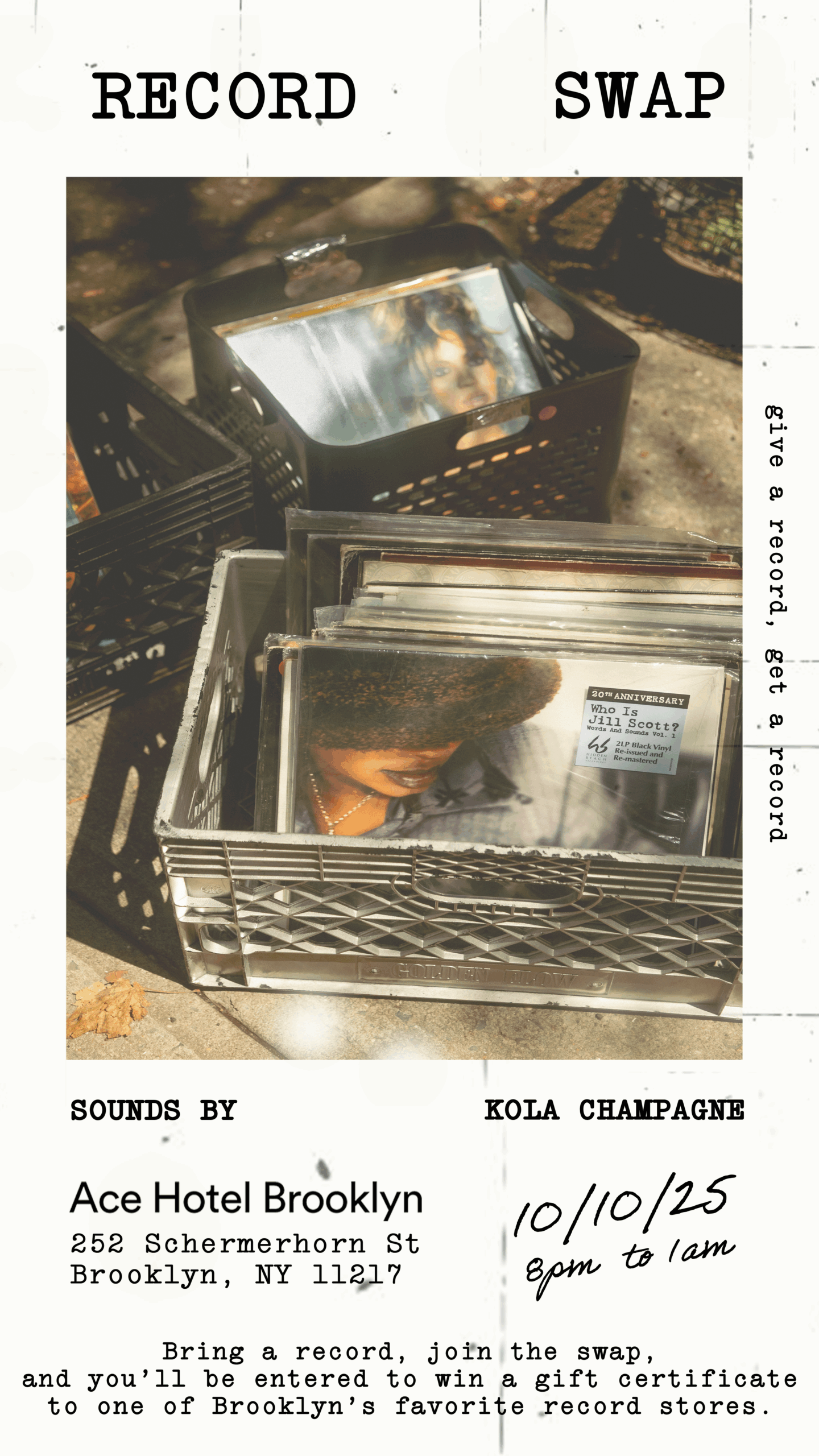 Step into the crate-digging spirit with DJ Kola Champagne for a community Record Swap built on a simple idea: give a record, get a record. Participate in the Record Swap and be entered to win a gift certificate from an independent record store in Brooklyn. It’s all about sharing music, discovering something new, and connecting with fellow vinyl lovers. Join us in The Lobby, Friday, October 10th, 8pm-1am – open to the public.