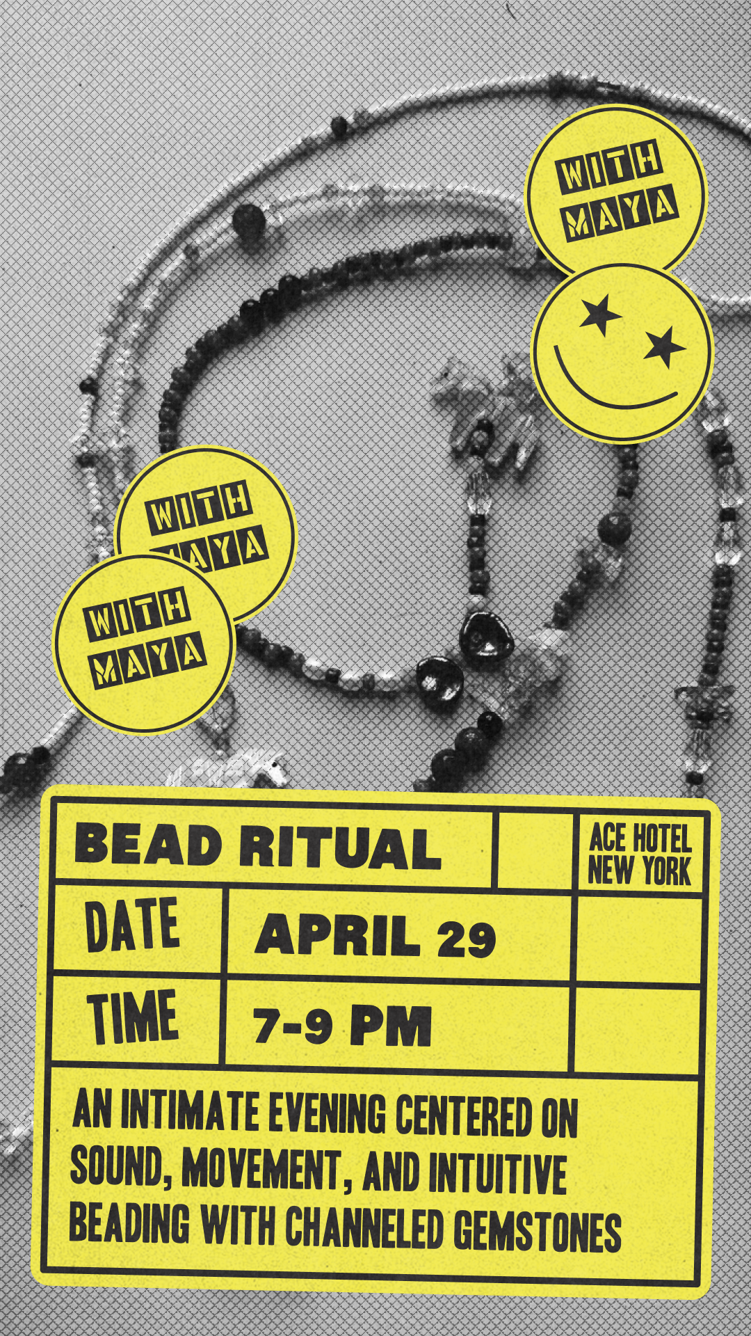 Join us at Ace Hotel New York for Bead Ritual — an intimate evening centered on sound, movement, and intuitive beading with channeled gemstones, guided by the creativity residing in your womb. We will meet in the gallery space to view Womb Portal — the matriarchal works of Image Atlas — to set the tone, and then make our way to a private room to bead from our hearts.