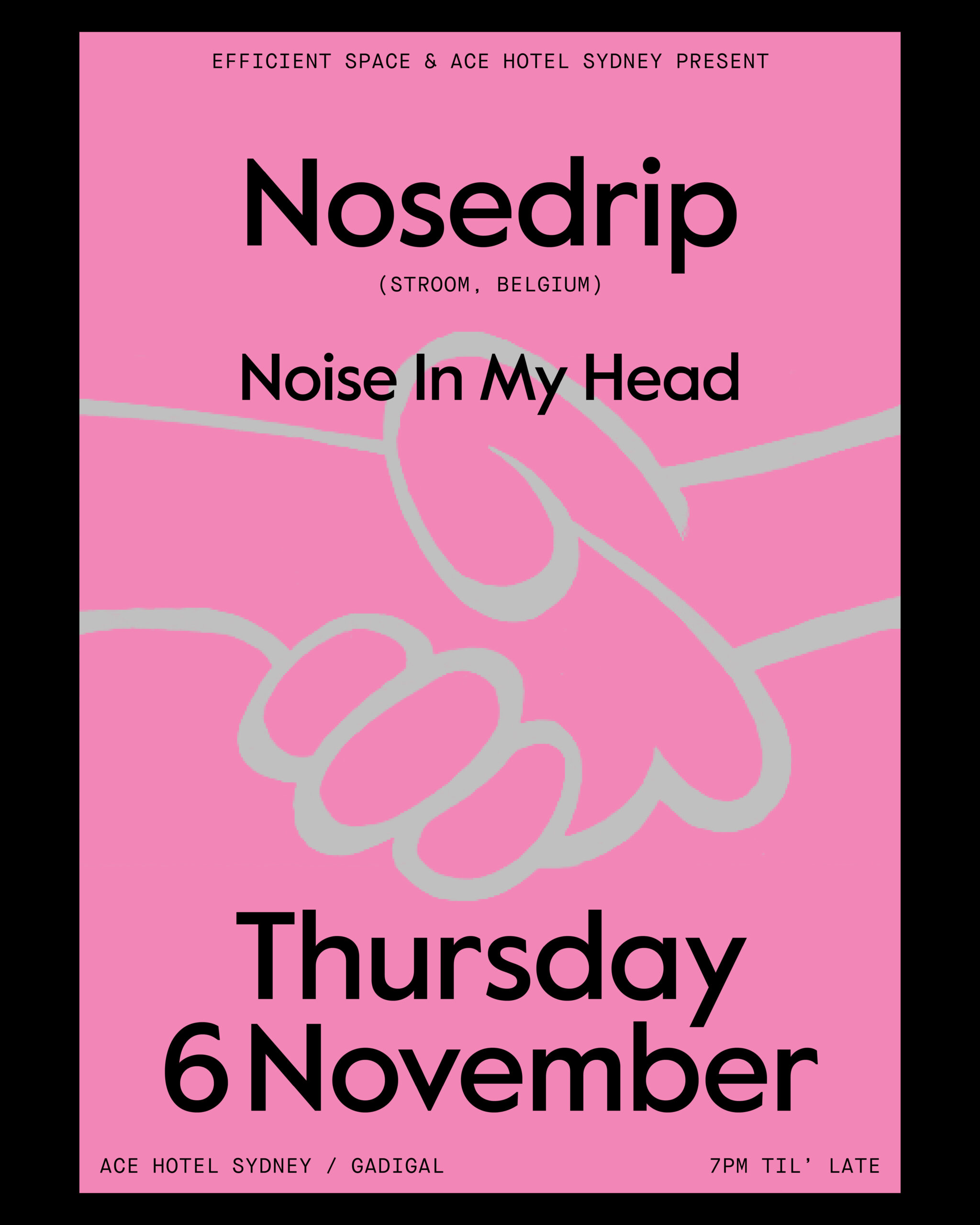 Efficient Space invites Belgian selector Nosedrip to the Ace Hotel Sydney lobby – architect of Stroom, a parallel universe to Efficient Space built on wit, melancholy and unshakable taste. Across a catalogue of domestic avant-pop, bio-tech trance, Belgian club archaeology and industrial lullabies, Stroom has become a sanctuary for the strange and sincere. Its world has given us Voice Actor, Milan W., Pablo’s Eye, and a mood all its own, sealed in oddball, museum-grade graphics. A master of the NTS radio hourlog and long-form sets, Nosedrip’s storytelling is part education, part hallucination and never to be missed. This low-lit session unfolds from 7 PM on Thursday 6 November, with support from Noise In My Head.