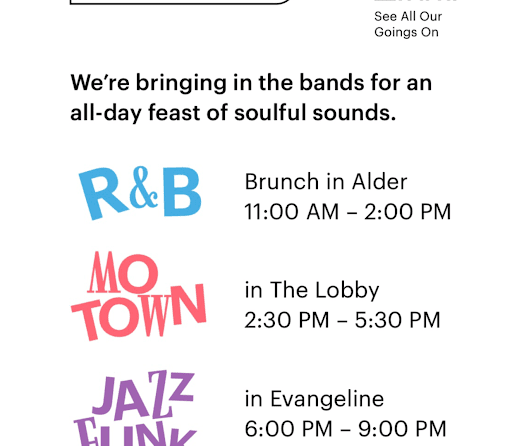 Ease into brunch at Alder with live R&B sets from 11AM–2PM. Let the afternoon drift into Motown grooves in the Lobby from 2:30–5:30PM, best enjoyed with a coffee or a cocktail in hand. As the sun sets, head upstairs to Evangeline Rooftop and close out the night with jazz-funk sounds from 6–9PM. Reservations for Alder and Evangeline are available via OpenTable.