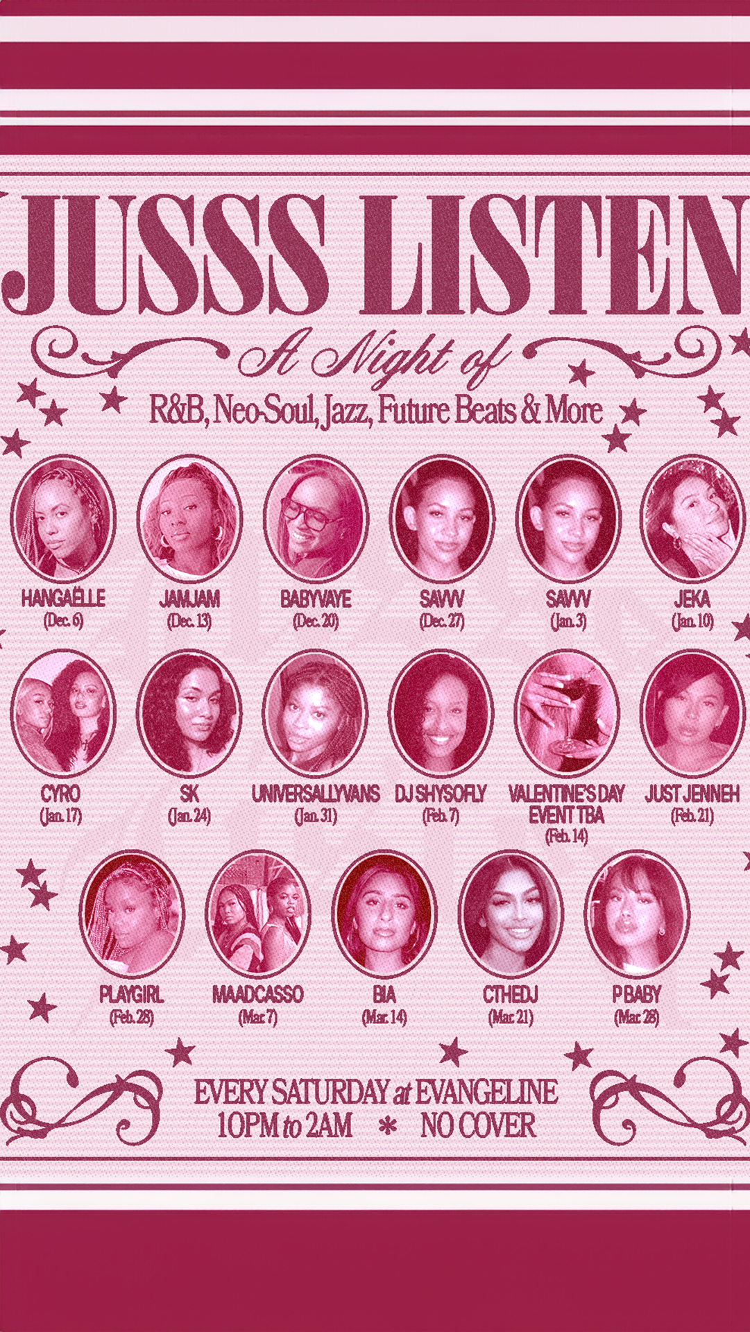 These residencies offer listeners the chance to experience the energy of the radio show in person, while providing a platform for local DJs to contribute their sound and share their passion for R&B, future beats, neo-soul, and more. Each night blends classics, new-age selections, and underrated gems, bringing the essence of JUSSS LISTEN to life.
